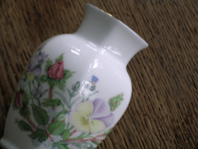 Wazonik z urzekającej i cenionej kolekcjonerskiej serii Wild Tudor, sygnowana najwyższą jakością jedwabistej szlachetnej porcelany Aynsley. Poetycki, uroczy wzór z kwiatów z dzikiego angielskiego ogrodu - jest czarnuszka, dzika róża, goździk, bratek, niezapominajka, chaber, nawet maciejka :)) Najwyższa klasa i niezaprzeczalna elegancja. Błyszczące szkliwienie, delikatne ryflowanie dekoracyjne i złocony rant.