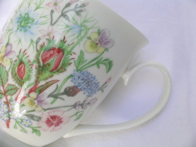 Duży, wygodny i baaardzo kwiatowy kubek porcelanowy, sygnowany jakością Aynsley, z kolekcjonerskiej serii Wild Tudor. Ryflowanie stópki, wygodne zawinięte ucho, jakość wykonania i błyszczące szkliwienie. Wewnątrz drobne ślady mieszania łyżeczką. Dół 5,5; góra 8,5; szer. 11,5; wysokość 10,5 cm. Stan zachowania bardzo dobry minus.