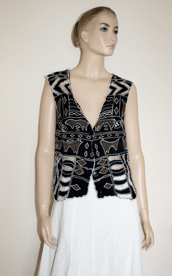 oryginalna, bluzeczka/kamizelka, prawdopodobnie szyta przez kogoś samodzielnie. dodatkowo zostały zwężone boki. materiał myślę, że bawełna. mankamenty krawieckie typu trochę krzywo zrobione dziurki, raczej nie rzucają się w oczy. świetny ażurowy materiał. na manekinie o rozmiarze 38. Polecam dla rozmiarów 38-40.