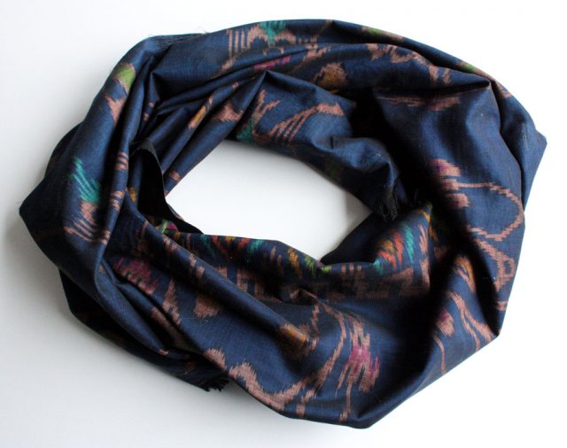 Wielki szal w azteckie wzory. Materiał oceniam na mieszankę jedwabiu i bawełny.