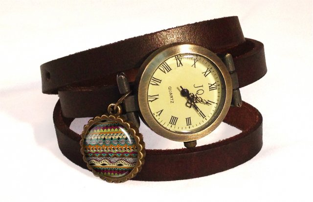 Zegarek ze skórzanym paskiem kilkakrotnie zakręcanym na ręku z ręcznie robioną zawieszką (kaboszonem).