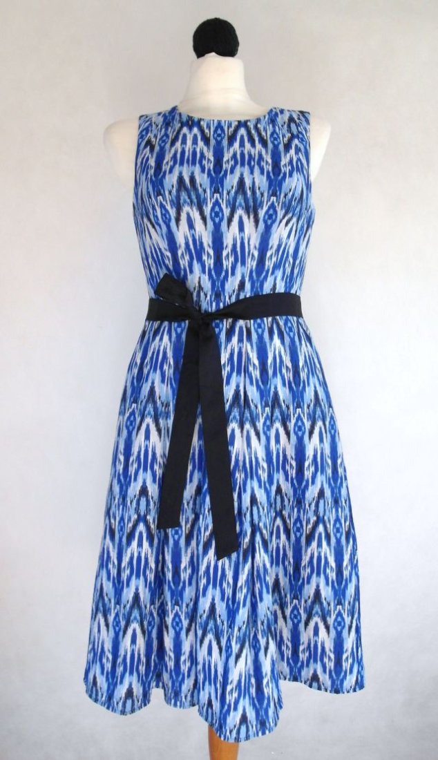 bardzo kobiecy fason, dopasowany top i rozszerzany dół. można przewiązać szarfą, paskiem.Na cienkiej podszewce.Wzór aztecki w rożnych odcieniach niebieskiego.Z tyłu długi suwak kryty. oryginalna, stan jak nowa.