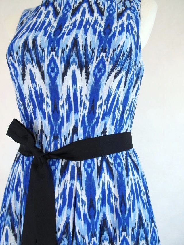 bardzo kobiecy fason, dopasowany top i rozszerzany dół. można przewiązać szarfą, paskiem.Na cienkiej podszewce.Wzór aztecki w rożnych odcieniach niebieskiego.Z tyłu długi suwak kryty. oryginalna, stan jak nowa.