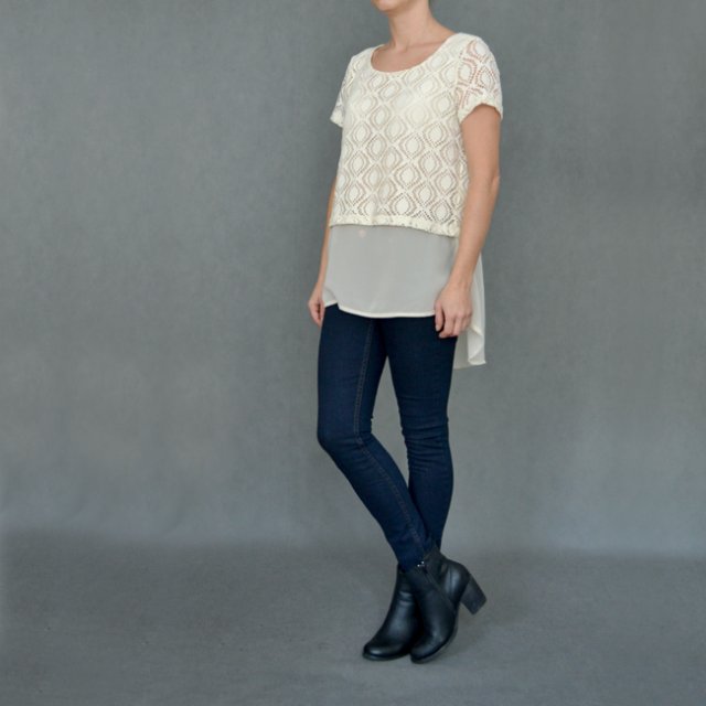 Bardzo fajna bluzeczka z ażuru. Pod spodem dłuższa, asymetryczna warstwa szyfonu.So swetrów, żakietów, jak i solo. Polecam.