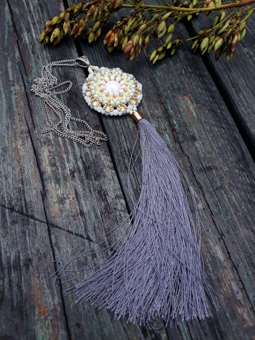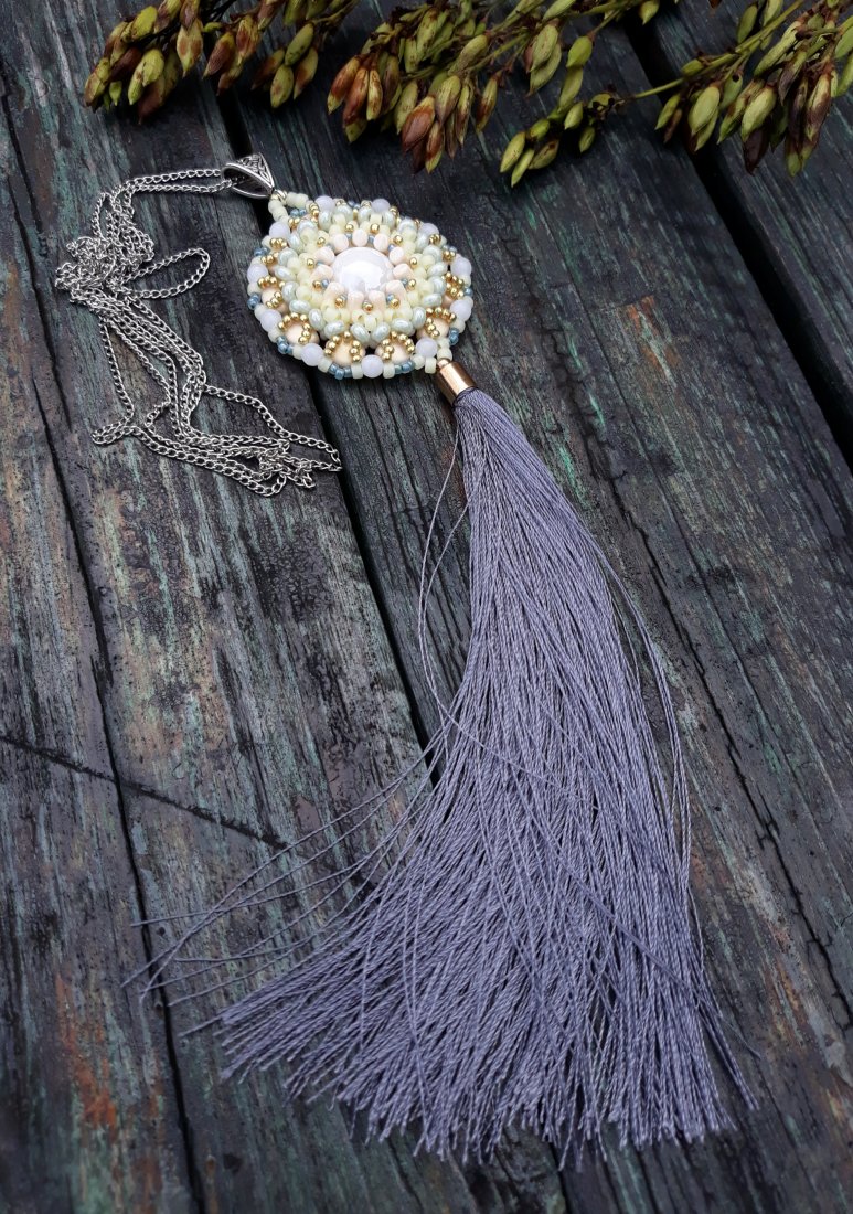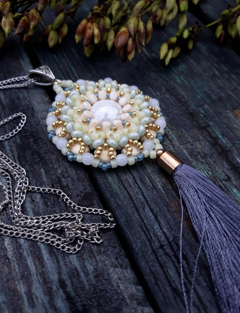 ,,ażur w pasteli,, to delikatny ażurowy wisior utrzymany w kolorystyce beżu, błękitu i szarości, wykonany ze szklanych koralików i kryształków. Całości dopełnia długi chwost w stalowym kolorze. Wisior zawieszony jest na ozdobnym łańcuszku.