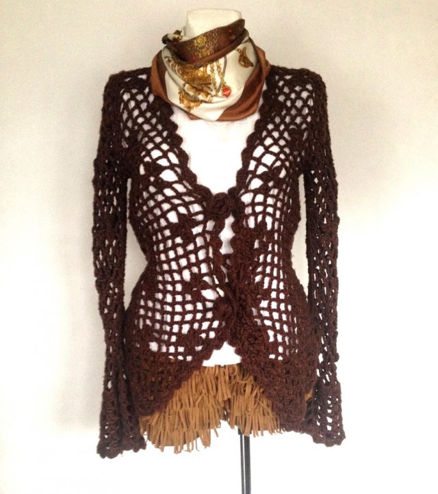 Ażurkowy brązowy sweter o fasonie rozkloszowanym, sweter asymetryczny,przód dłuższy, tył krótszy. wkładany przez głowę, jako ozdobę posiada guziki rożyczki, ale nie rozpinają się. Jest śliczny, nałożony na każdą zwykłą koszulę doda uroku. Rękawy sweterka na dole są rozkloszowane.