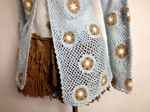 Dłuższy ażurkowy żakiet/blezer o fasonie rozkloszowanym w ślicznym błękitnym kolorze w kwiatuszki, z przodu wiązany.