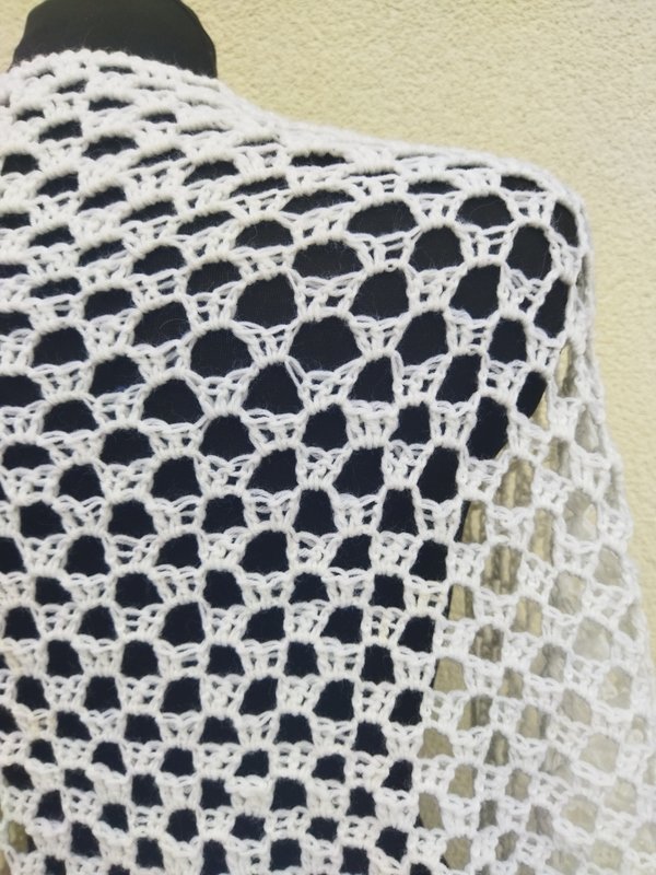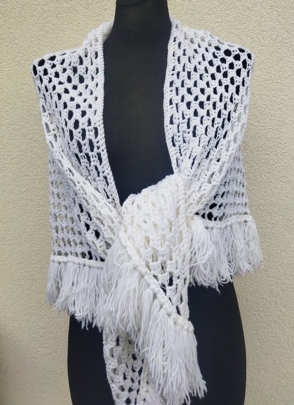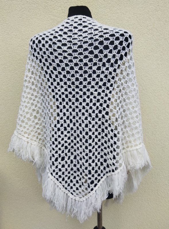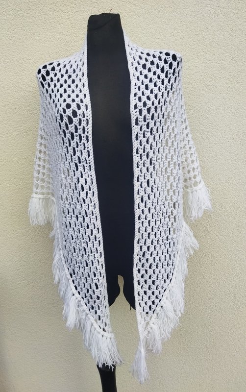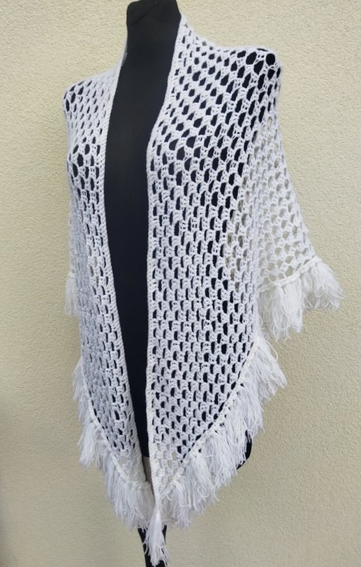Trójkątna akrylowa śnieżnobiała chusta wykonana na szydełku. wykończona frędzlami.