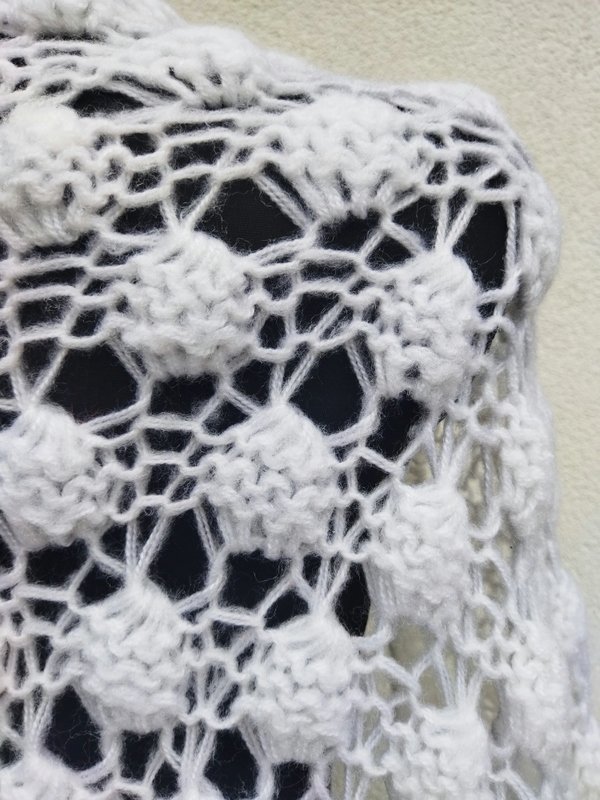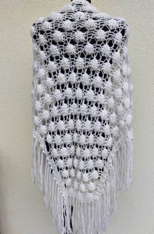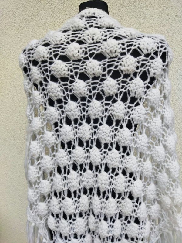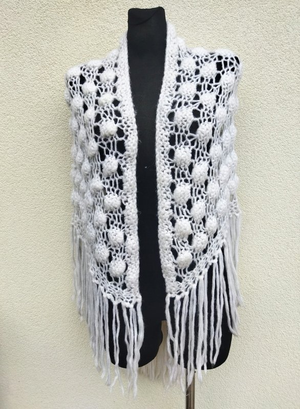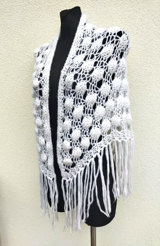 Ażurowa trójkątna szydełkowa chusta z wzorem w orzeszki z akrylowej włóczki w białym kolorze. Wykończona frędzlami.
