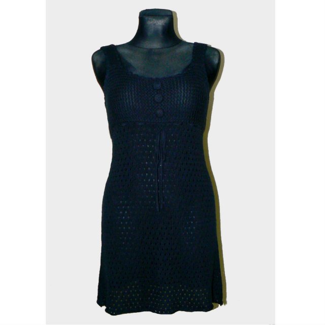 Dzianinowa sukienka o ażurowym splocie w głębokim odcieniu granatu. Ma spory dekolt. Idealna na kostium kąpielowy, ale też do założenia na basicową koszulkę.