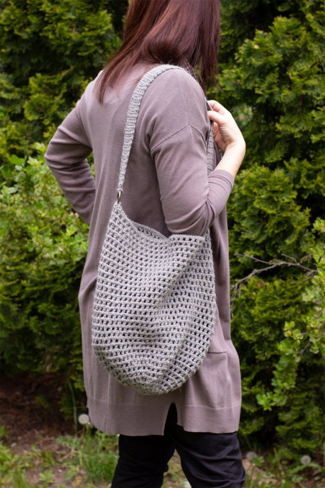 Ręcznie robiona torebka damska. Wykonana na szydełku z włóczki tkackiej w odcieniu szarości. Uchwyty zamontowane na metalowych kółkach. Prać ręcznie w 30 st. Ażurowy wzór dodaje torebce lekkości, idealna na lato.