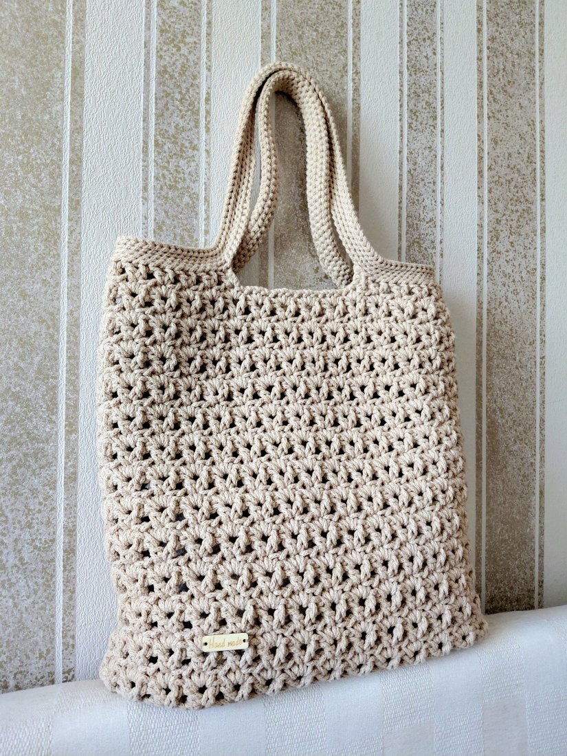 Piękna torebka w kolorze ciepłego beżu, którą wykonałam według autorskiego projektu oryginalnym splotem ażurowym, zaś spód jest owalny szerokości 11cm.