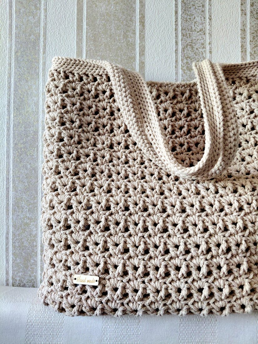 Ażurowa torebka, średniej wielkości o wymiarach 36cm×39cm zapinana jest na magnes i zawieszona na wygodnych rączkach długości 45cm.