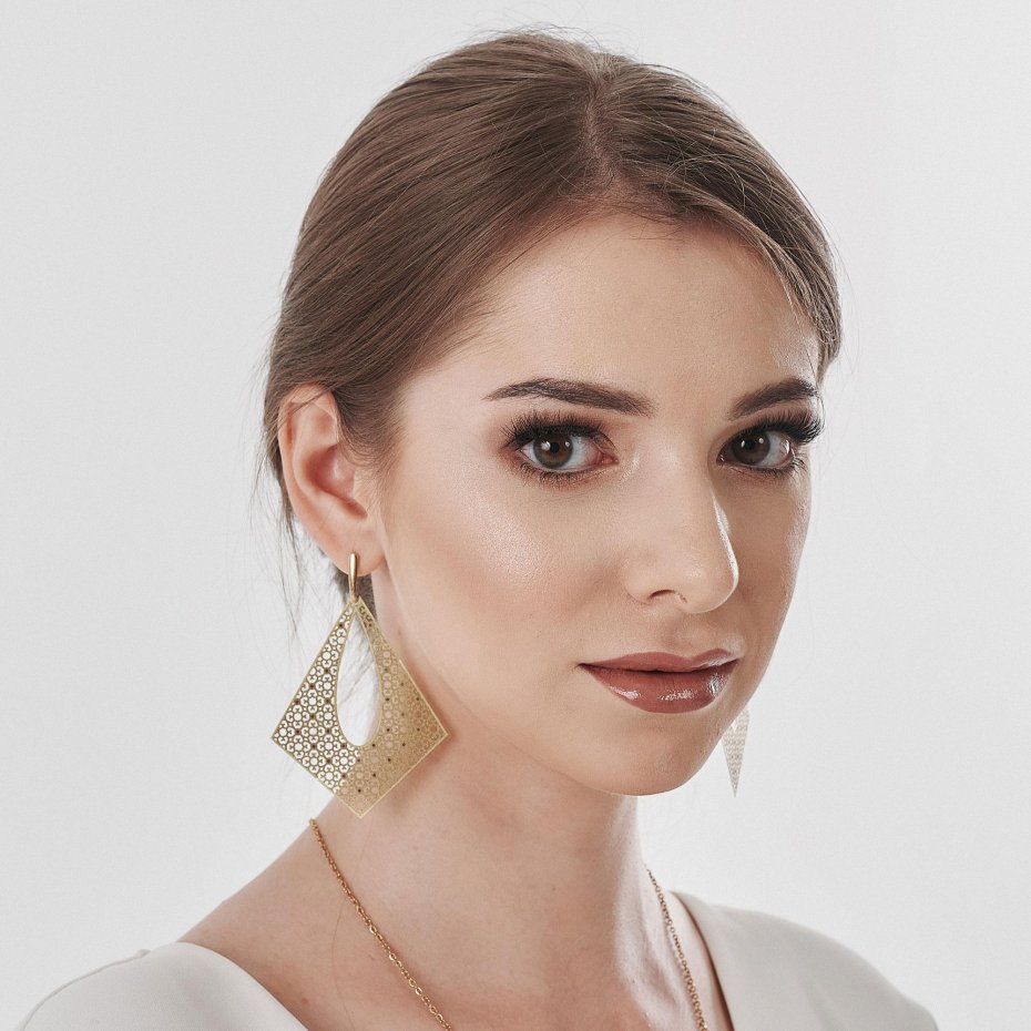 Oryginalne kolczyki dla osób, które przy doborze biżuterii stawiają na nowatorskie formy i klasyczne kolory. Kolczyki w kształcie rombu przypominającego odwrócony diament zostały wykończone ręcznie poprzez satynowanie i pokrycie ozdobnej blaszki warstwą ochronną. Kolczyki z pewnością ucieszą bliską osobę, doskonale sprawdzą się także zestawione ze stylizacjami wieczorowymi. Mimo dużego rozmiaru, kolczyki nie obciążają uszu. Ażurowe elementy powstały ze złocistego mosiądzu