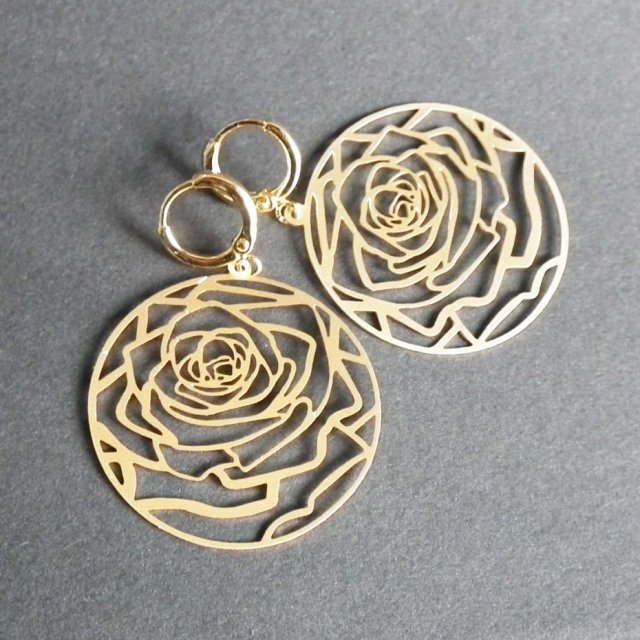 Piękne kolczyki z unikatowymi ażurowymi zawieszkami w kształcie róży. Bardzo lekkie i efektowne. Całość wykonana z metalu antyalergicznego pokrytego 16 karatowym złotem. Idealne do stroju wieczorowego. Do kompletu można domówić naszyjnik lub bransoletę z taką samą zawieszką.