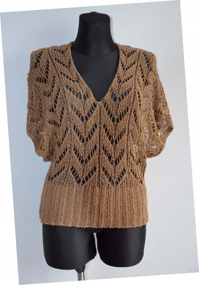 Elegancki ażurowy sweterek na planie nietoperza. Wygląda jak dziergany na szydełku. Kolor to odcień brązu, w splot wpleciona nić koloru ciemnego złota. Z przodu dekolt. Rękawy krótkie. Ściągacz u dołu. Tył wiązany u góry, przy szyi.