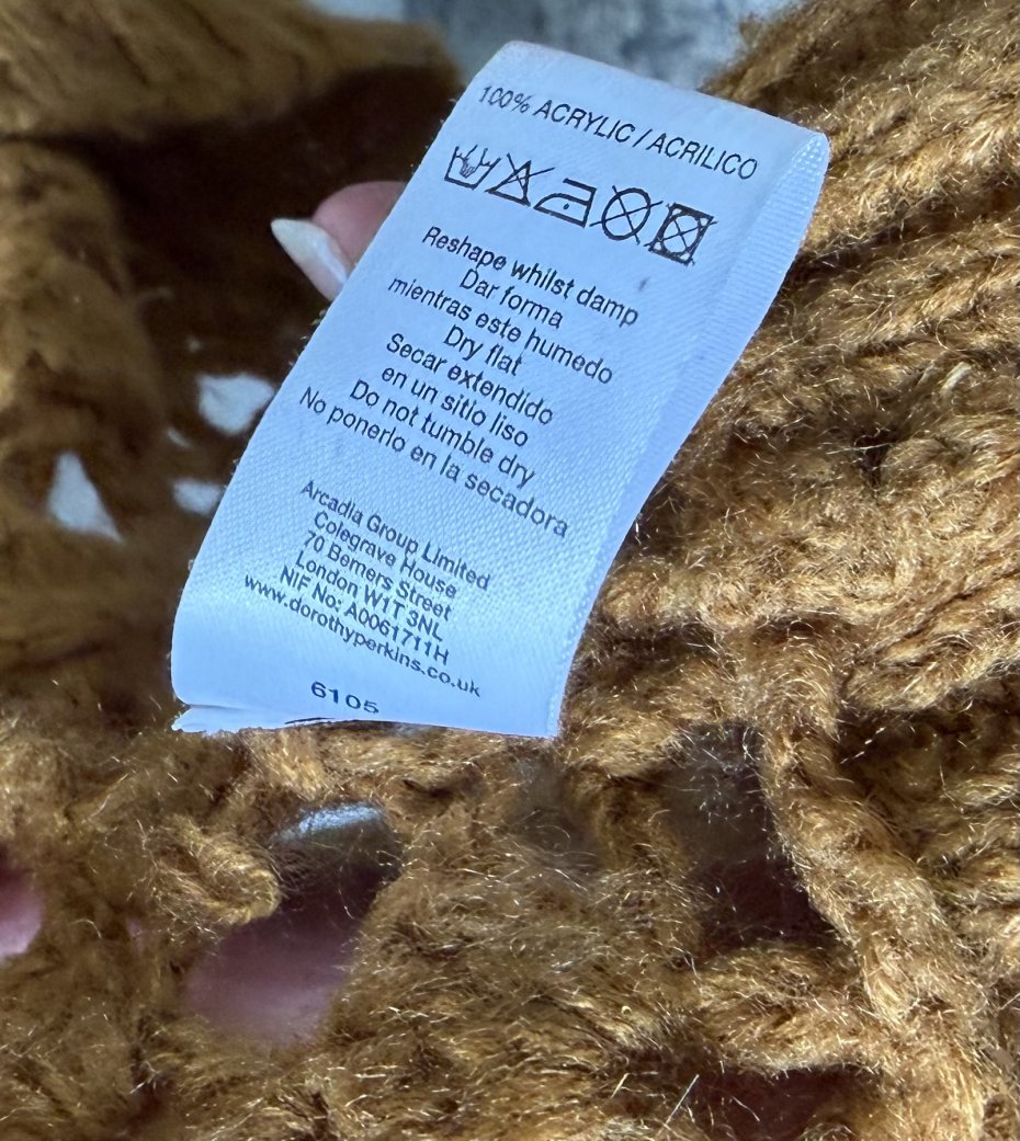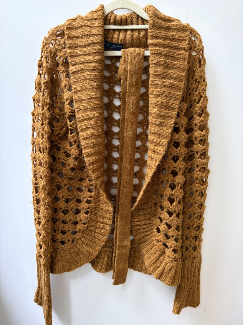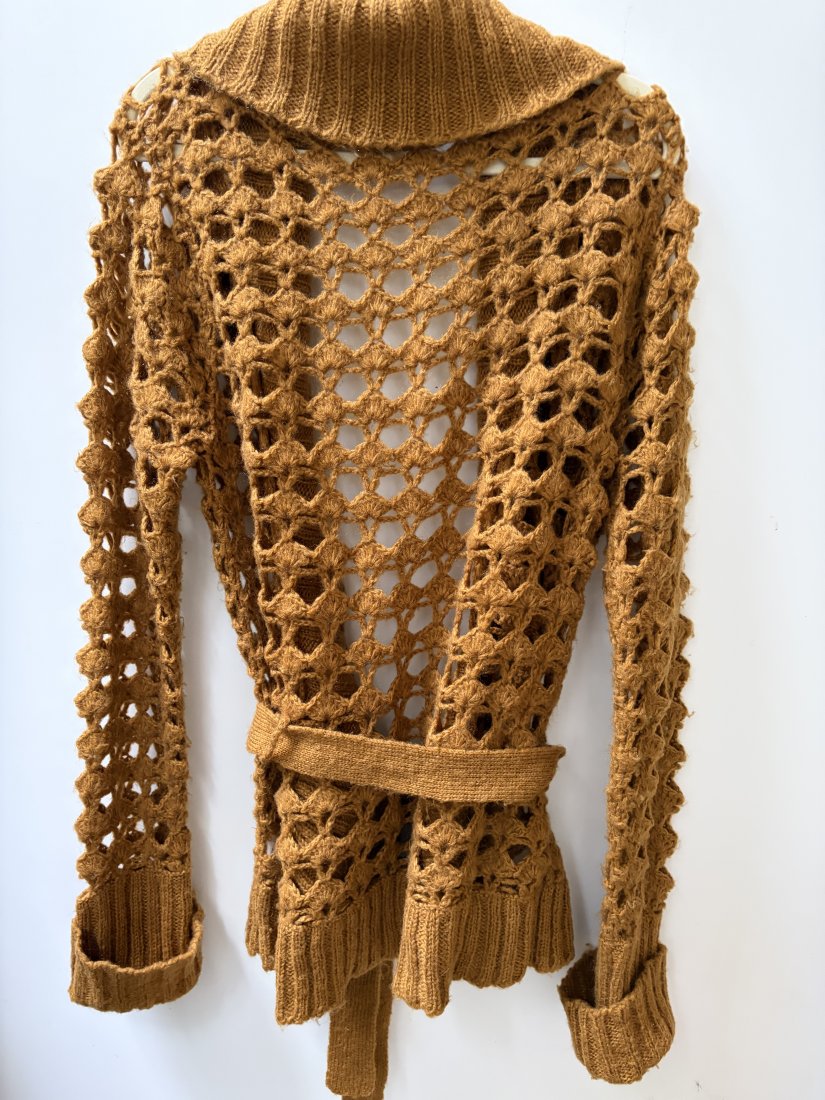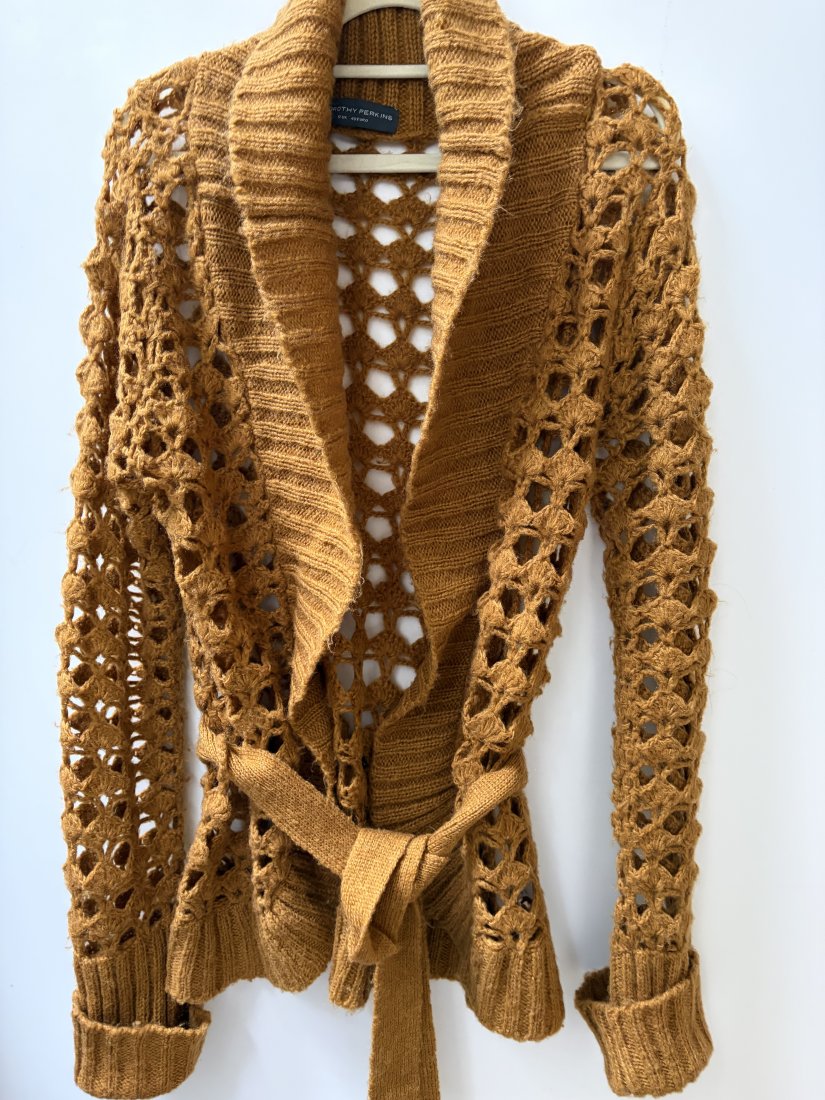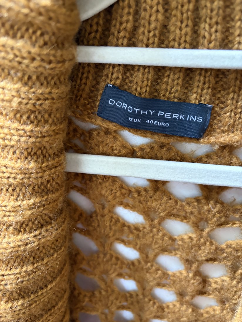 DOROTHY PERKINS ROZM.12 . Ażurowy sweter z paskiem w pięknym miodowym kolorze . 100% acryl. Metka firmowa i metka ze składem obecne . Rozmiar z metki 12 . Długie rękawy z podwijanym ściągaczem , ściągacz jaki wykończenie rownież miękko zaokrąglony dół . Szlufki do paska po bokach i pasek 4 x 185 pachy 56 długość od ramienia 68 długość ściągacza przy rękawach 21 cm Wymiary podane mierzone na płasko, bez rozciągania . Obecne wszystkie metki . Stan zachowania dobry - drobne ślady użytkowania , Proszę sprawdzić wymiary w opisie .