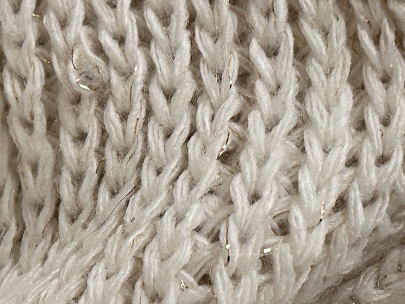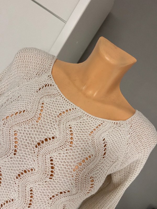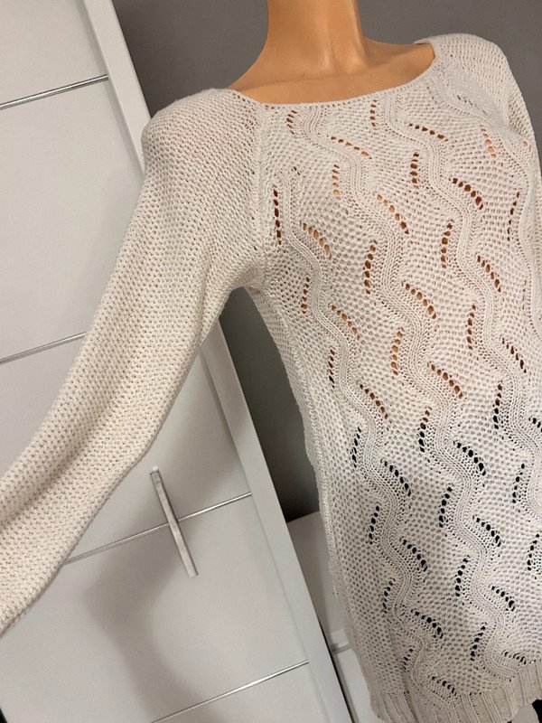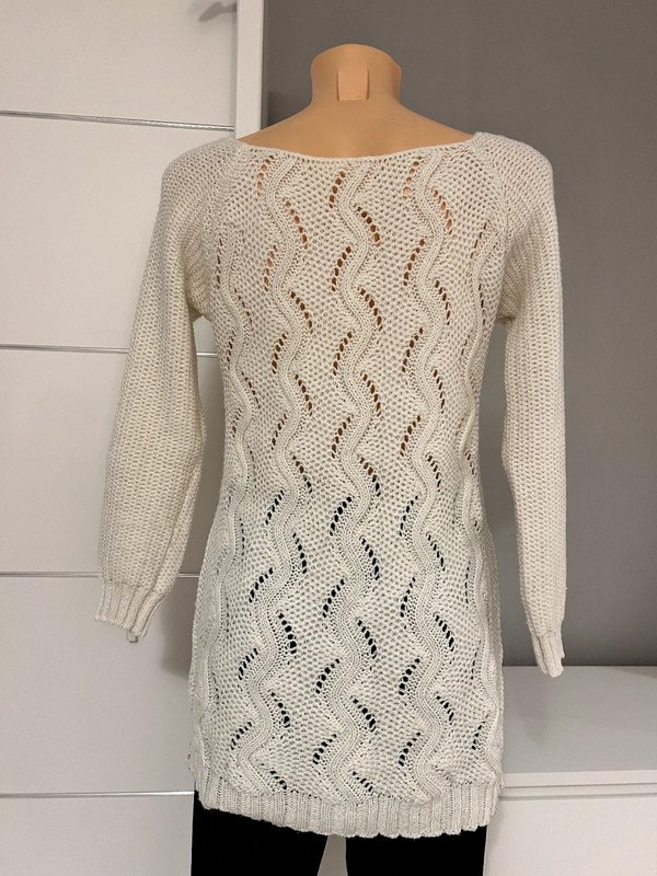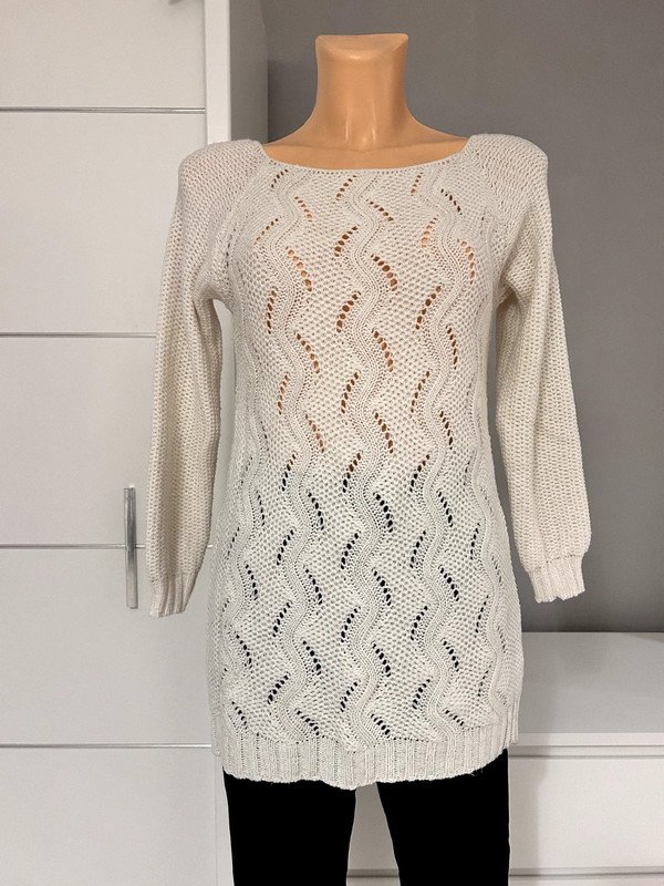 Długi sweter, tunika albo sukienka - wybierz sama. Nie posiada metki z rozmiarem, ale moim zdaniem to S/M. Napisz do mnie o wymiary przed zakupem. Jest kremowy, posiada wplecioną złotą nitkę.