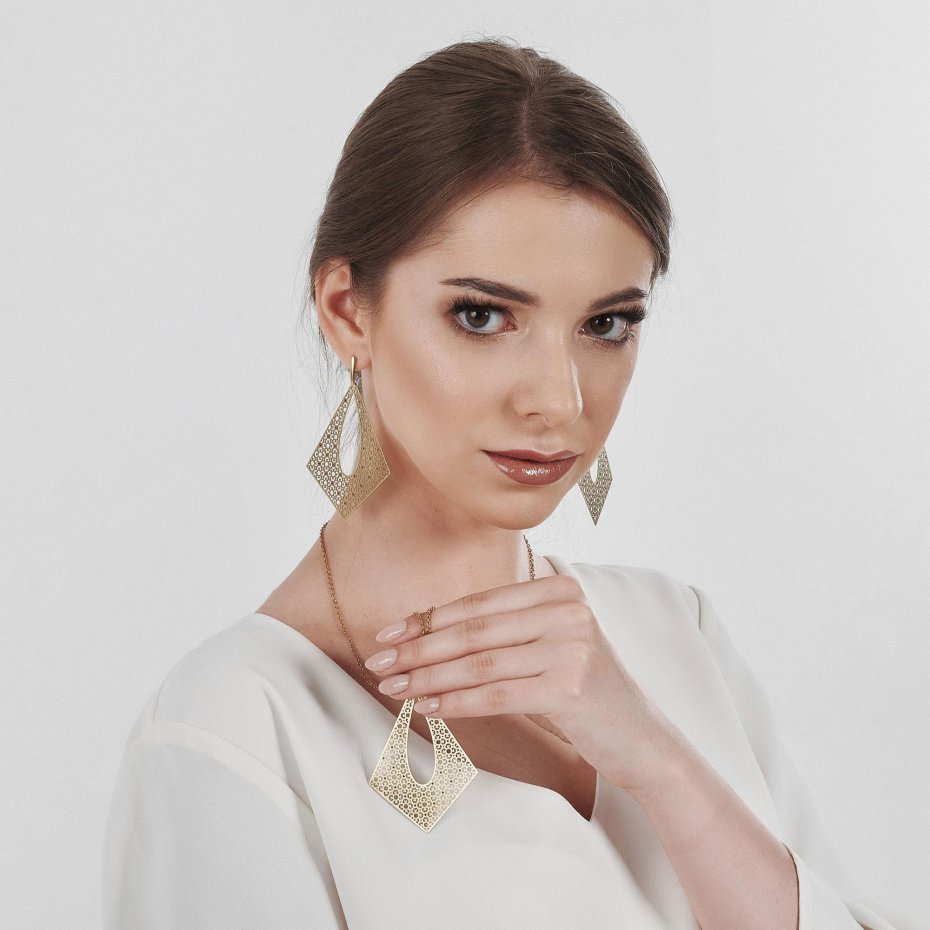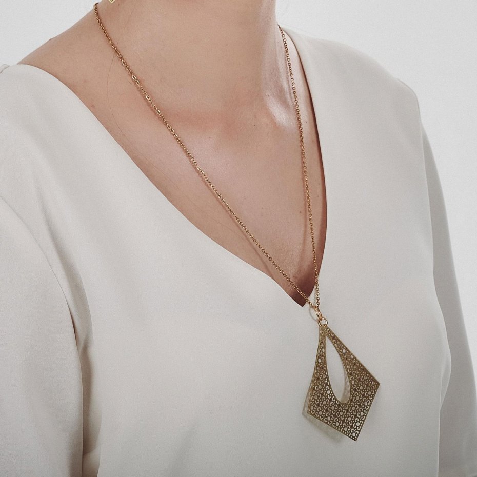 Oryginalny naszyjnik dla osób, które przy doborze biżuterii stawiają na nowatorskie formy i klasyczne kolory. Naszyjnik w kształcie rombu przypominającego odwrócony diament został wykończony ręcznie poprzez satynowanie i pokrycie ozdobnej blaszki warstwą ochronną. Naszyjnik z pewnością ucieszy bliską osobę, doskonale sprawdzi się także zestawiony ze stylizacjami wieczorowymi. Mimo dużego rozmiaru nie obciąża szyi. Ażurowy element powstał ze złocistego mosiądzu.