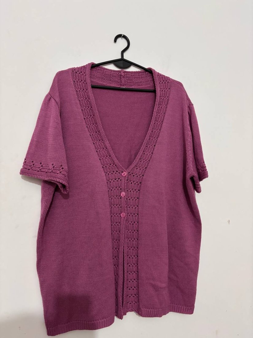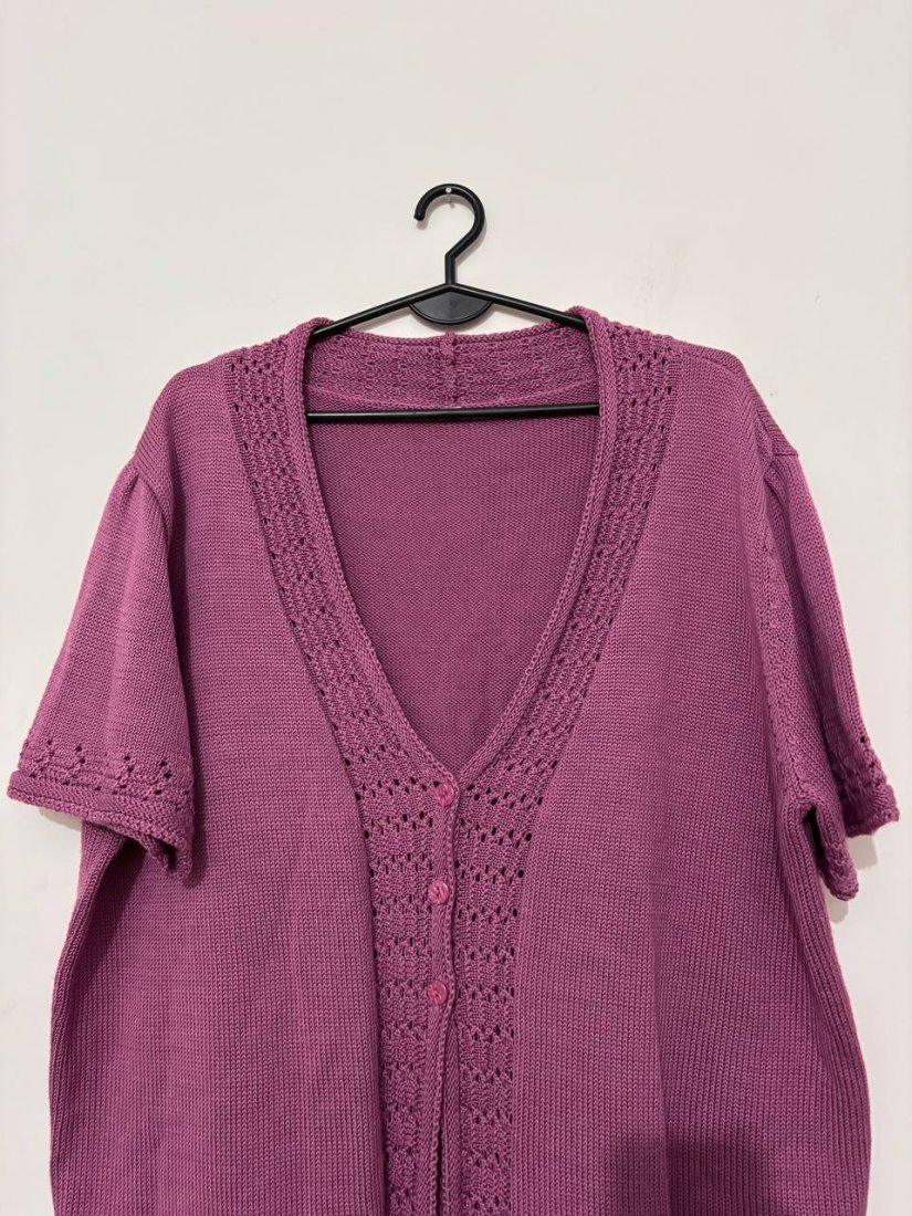 Sprzedam uroczy różowy kardigan z krótkim rękawem, wykonany z przyjemnej, oddychającej dzianiny. Posiada ażurowe wykończenie przy dekolcie i na froncie oraz guziki w tym samym kolorze. Idealny na wiosnę/lato lub jako lekka narzutka do stylizacji casual.