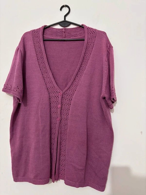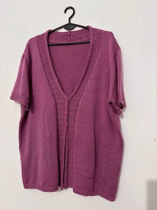 Sprzedam uroczy różowy kardigan z krótkim rękawem, wykonany z przyjemnej, oddychającej dzianiny. Posiada ażurowe wykończenie przy dekolcie i na froncie oraz guziki w tym samym kolorze. Idealny na wiosnę/lato lub jako lekka narzutka do stylizacji casual.