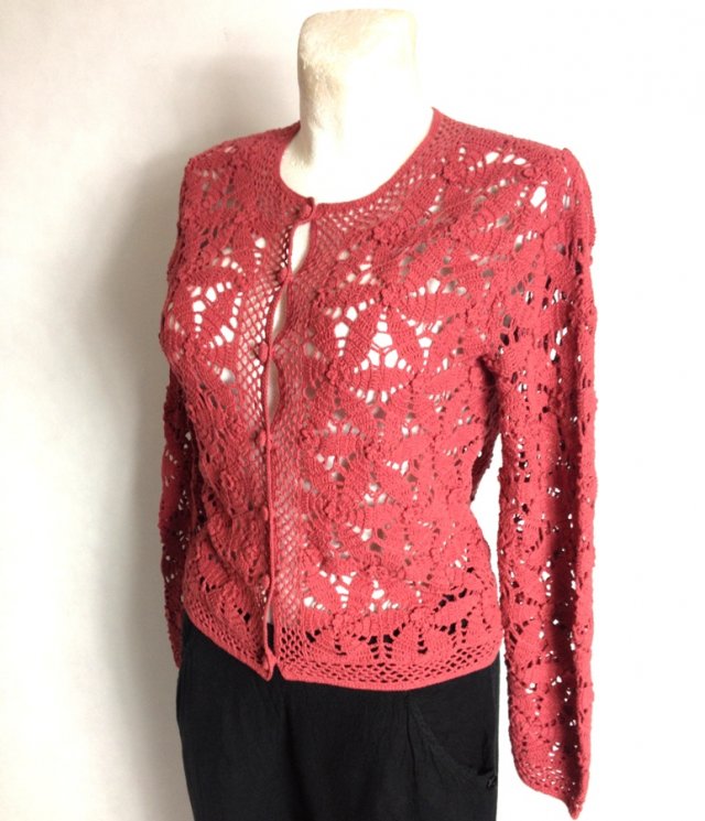 Śliczny ażurowy żakiecik o prostym fasonie zapinany na guziczki, wykonany jak sądzę z bawełny z jakimś dodatkiem (elastyczny). Stan idealny- Jak nowy.