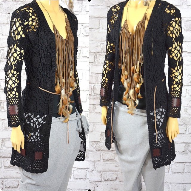 Tagi: #ażurowy kardigan, #długa narzutka, #skórzany