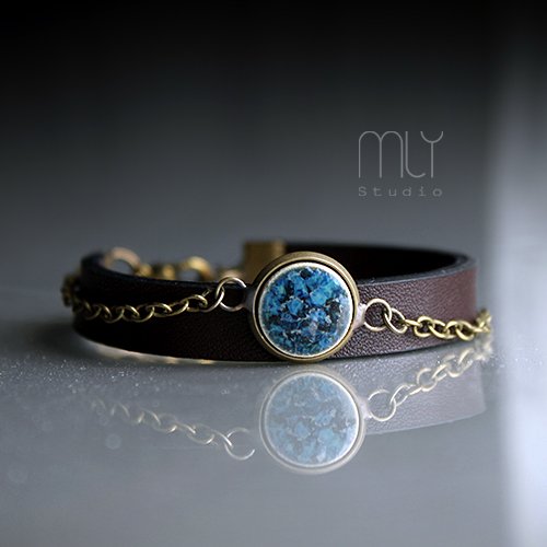 Efektowna bransoletka wykonana z rzemienia jubilerskiego, elementów w kolorze starego złota i ręcznie wykonanej ceramicznej zawieszki, szkliwionej mieszanką zielonych szkliw z efektem plamek,. Obwód regulowany, długość elementu ceramicznego ok 1,2cm Polecam. Termin realizacji zamówienia to 1-2 dni.