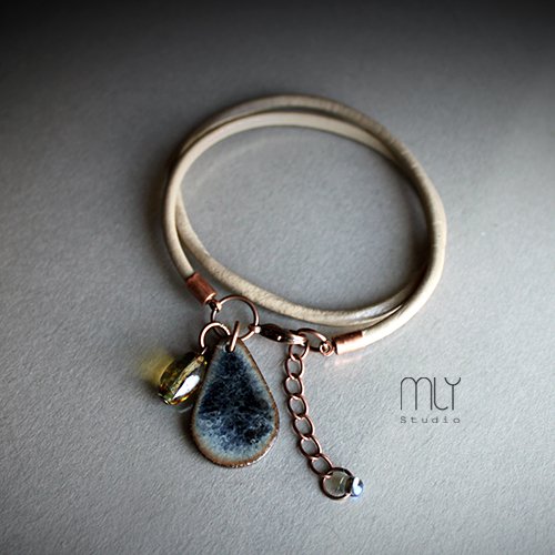 Efektowna bransoletka wykonana z linki kauczukowej w kolorze beżowym, elementów w kolorze miedzi i ręcznie wykonanej ceramicznej zawieszki, szkliwionej szarobłekitnym szkliwem, Obwód regulowany, długość elementu ceramicznego ok 2,5cm. Polecam . Termin realizacji zamówienia to 1-2 dni.