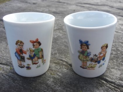 Zestaw dwóch uroczych kubeczków, pewnie z założenia dla dzieci :) Z pięknymi, radosnymi w barwach scenkami. W całej swej delikatnej urodzie - solidne, dla dziecka praktyczne i... nie chińskie ! :) Średnica góry 7, dołu 5,5; wysokość 8,5 cm. Stan zachowania bardzo dobry.