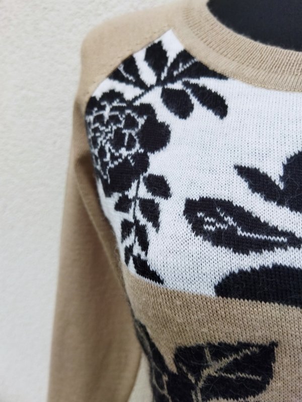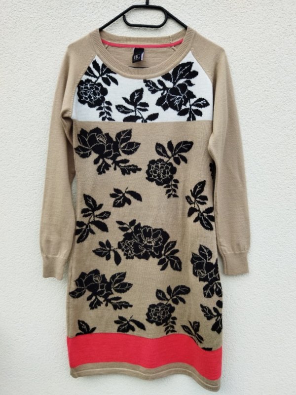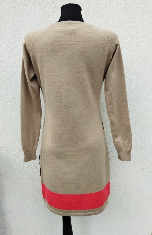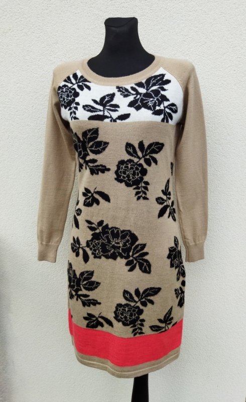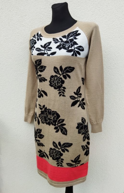 Dzianinowa bardzo dobrej jakości sukienka z akrylu i wełny z wzorzystym przodem, w kolorystyce ciepłego beżu, bieli, czerni i koralowej czerwieni. Owalny dekolt , raglanowe rękawy.