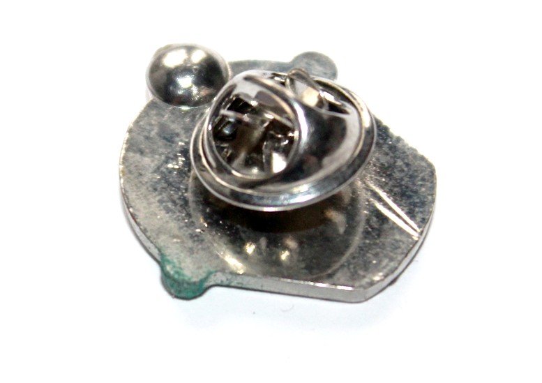 Przypinka vintage przedstawiająca puchar i liczne różne loga.