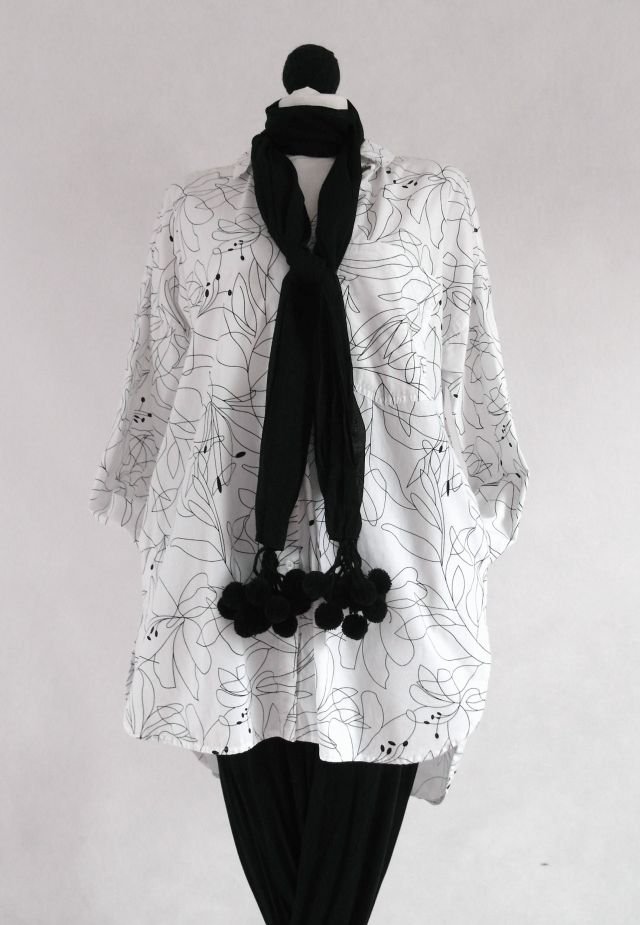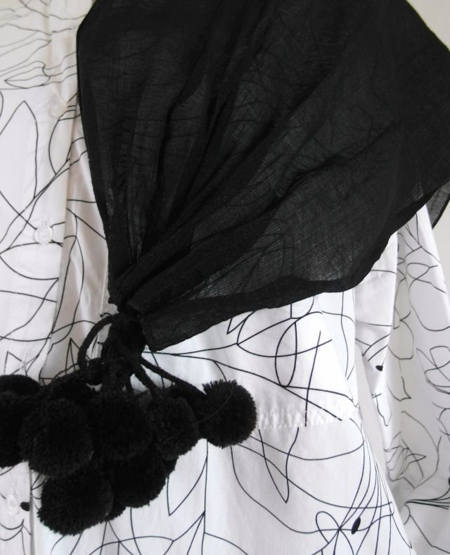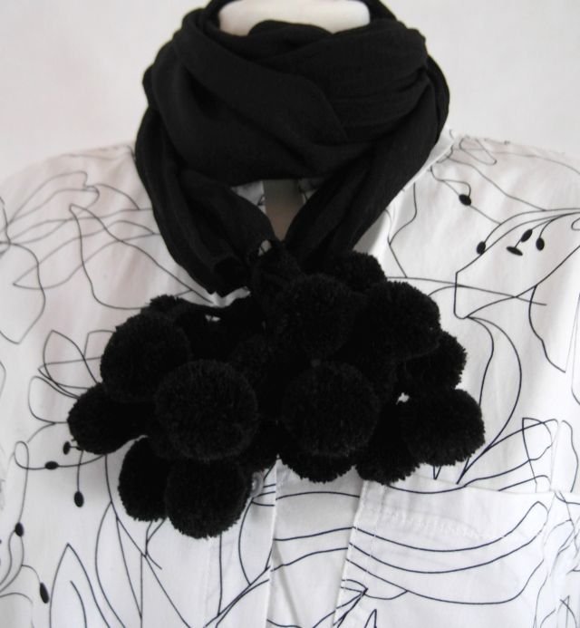 cienki czarny szaliczek zakończony kiścią bąbelków.
