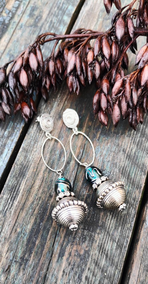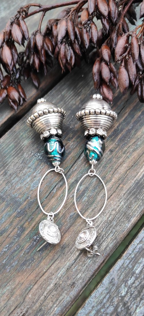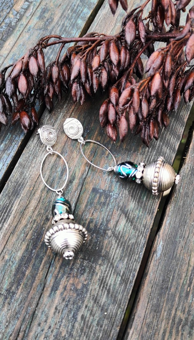 ,, bączki,, to oryginalne kolczyki w stylu retro wykonane z owalnych obręczy i koralików w kolorze srebrnym i zielonym. Kolczyki zawieszone są na ozdobnych biglach typu sztyft w kolorze srebrnym.