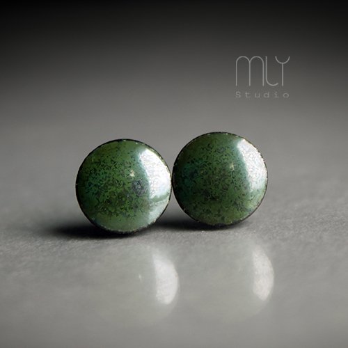 Ceramiczne, lekko nieregularne kolczyki w formie sztyftów, ręcznie wykonane z delikatnej gliny kamionkowej, jednostronnie szkliwione zielonym szkliwem z efektem plamek, na antyalergicznych sztyftach w kolorze srebrnym.Średnica ok. 11mm. Polecam
