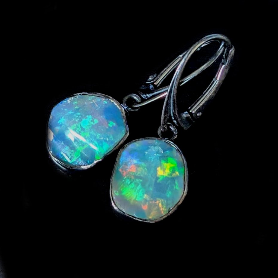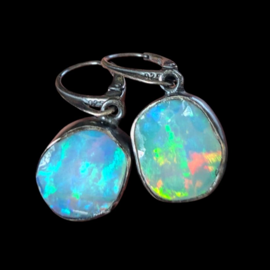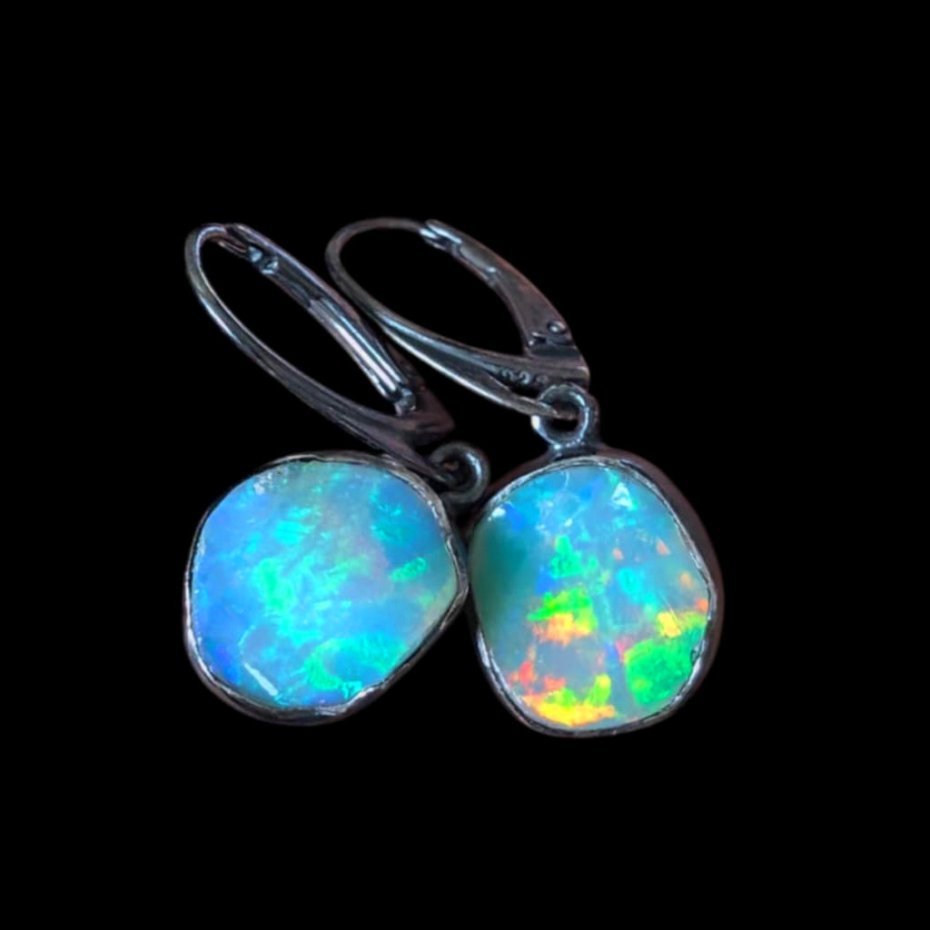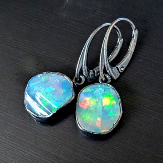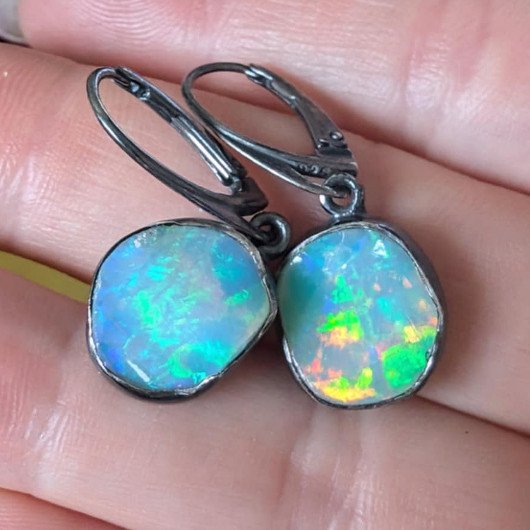 Kolczyki wykonane z oksydowanego srebra 925 oraz naturalnych opali szlachetnych z Etiopii. Kamienie zachwycają multikolorową opalizacją Wymiary elementów oprawy kamienia 14 x 11 mm. Zapinane na klasyczne bigle angielskie. Długość całości z biglami 32 mm. Waga jednego kolczyka 2,5 grama. Kolczyki zostaną zapakowane w ozdobne pudełeczko.