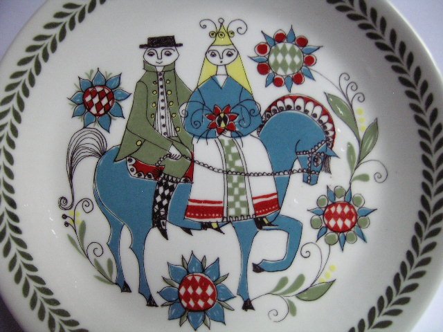 Ujmującą, prościutką i radosną grafiką zdobiony talerz porcelanowy, sygnowany Saga Norsk Design, Norway. Solidne tworzywo, filigranowość kreski, kolorystyka jak z lat 70-tych i romantyczna symbolika :) Błyszczące wykończenie. Może być użytkowy. Z tyłu profesjonalny uchwyt do powieszenia. 20,5 x 2 cm. Stan zachowania bardzo dobry.