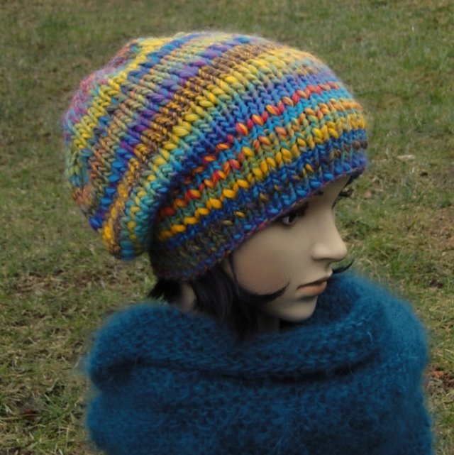 Bardzo ciepła, gruba, mięsista ( wykonana niezbyt luźno, aby nie hulał po niej wiatr :) ) i przyjemna w dotyku czapa wykonana ręcznie na drutach z rewelacyjnej włóczki prod. hiszpańskiej ( 53% virgin wool, 47% akryl), w bajecznych kolorach. Czapka jest dwustronna i bezszwowa, dzięki czemu można dowolnie układać kolory przy twarzy. Rozmiar czapki : obwód od 54 do 56 cm, wysokość ok. 30 cm. Bardzo twarzowa. Dużo ładniejsza, niż na zdjęciach. Polecam.