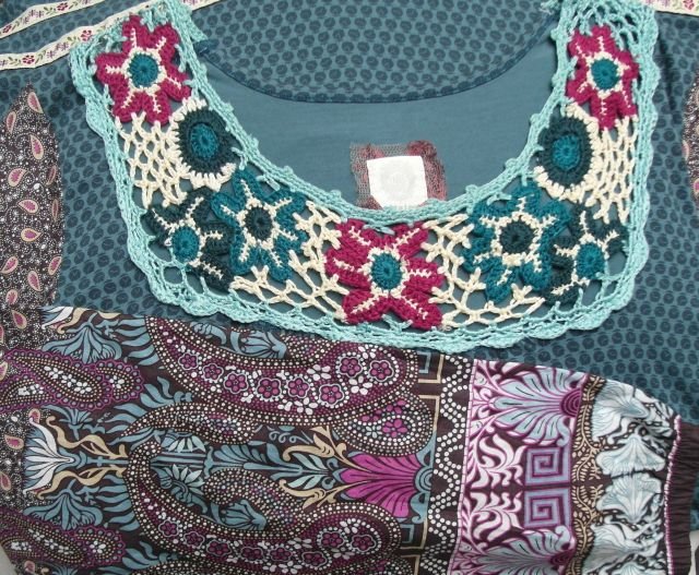 Ozdobny, szydełkowy dekolt, wzorzyste rękawy tworzą dosyć oryginalną całość.Kolor tuniki - ciemna szmaragdowa zieleń w drobne wzorki.
