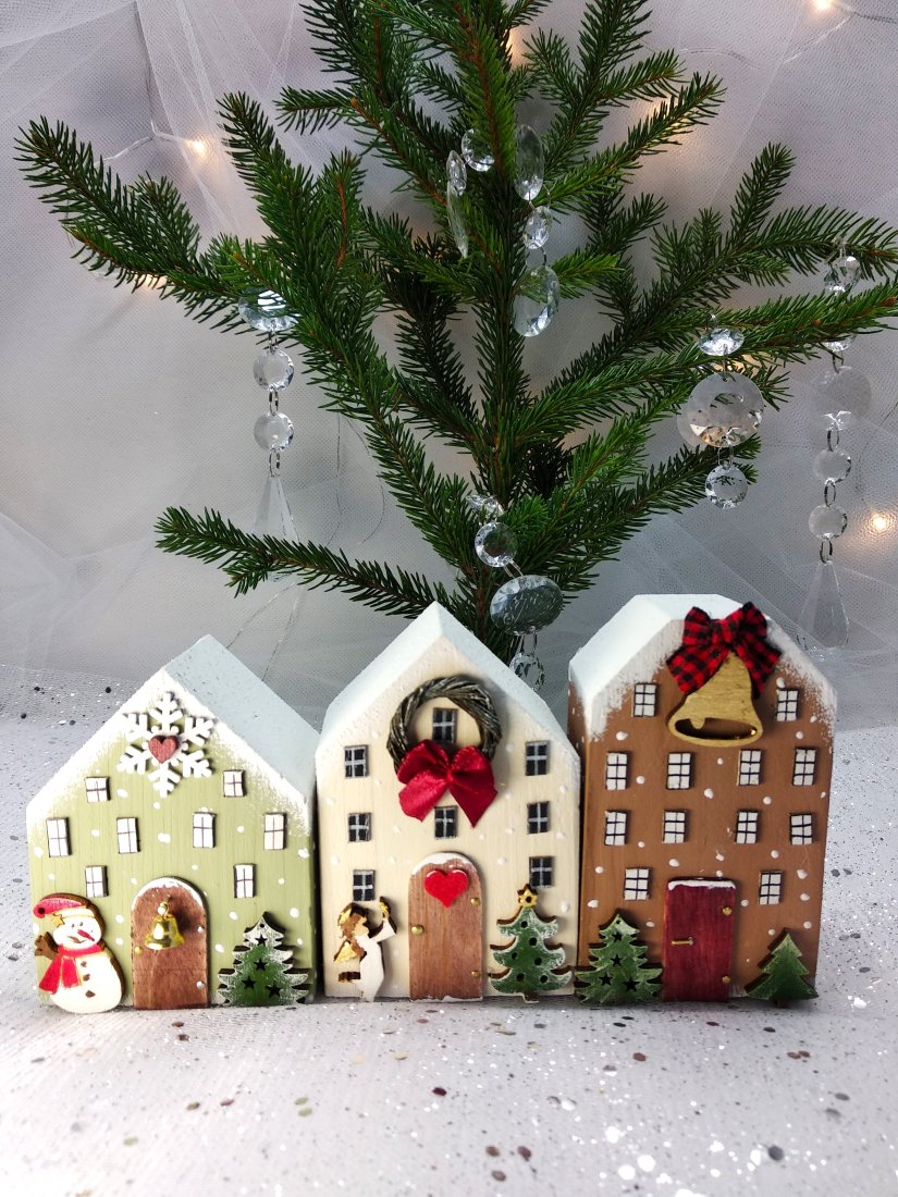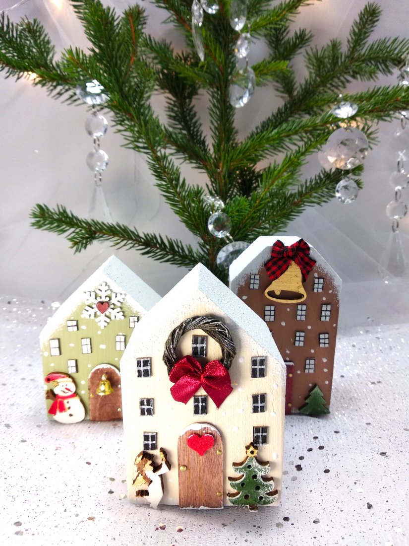 Trzy dekoracyjne domki wykonane są z drewna sosnowego. Pomalowane ekologicznymi farbami akrylowymi. Domki są uroczą i oryginalną dekoracją świąteczną, która wprowadzi do każdego wnętrza ciepłą i przytulną atmosferę. Mogą być samodzielną dekoracją, ale również elementem większej kompozycji. świetnie prezentują się na półce, komodzie lub parapecie.