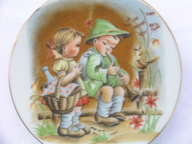 Dawnej daty ilustracją zdobny, bajkowy talerzyk porcelanowy z dziecięcym portretem romantycznym :) Po prostu uroczy... i te kolory ! Satynowe wykończenie i złocenie na rancie. Nie sygnowany a z duszą :) 8 x 1 cm. Stan zachowania bardzo dobry.