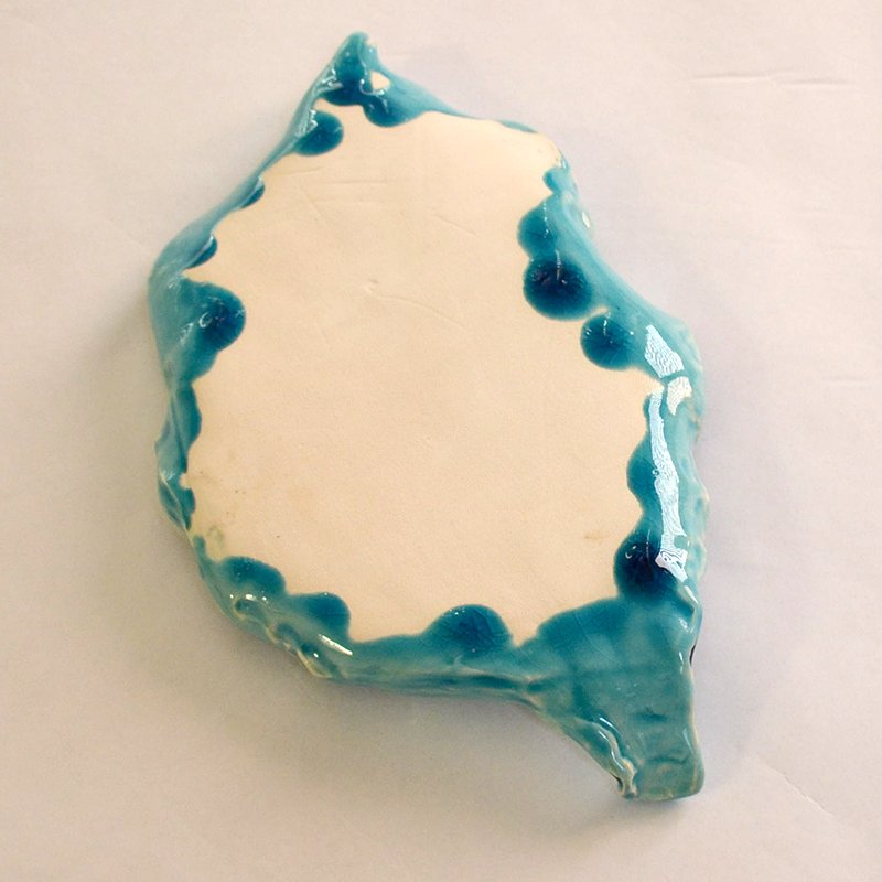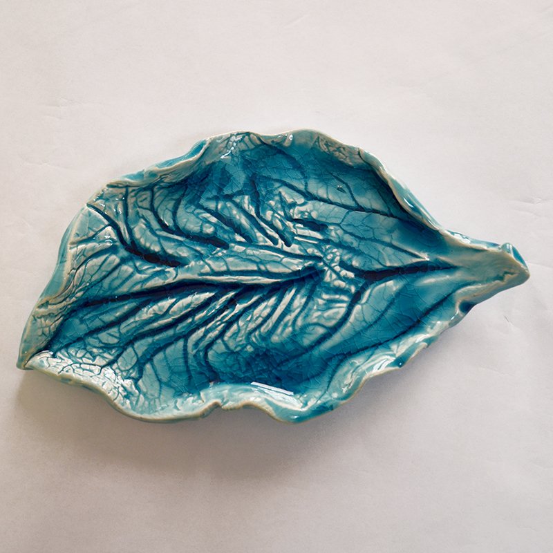 Ręcznie formowana patera w kształcie liścia, z jasnej gliny szamotowej. Szkliwiona i dwukrotnie wypalana w piecu w temp. 1080 stopni C. Pokryta szkliwem dopuszczonym do kontaktu z żywnością. Nie nadaje się do mycia w zmywarce. Szkliwo turkusowe z połyskiem. Wymiary: ok. 26 x 16 cm wys. ok.2,5 cm. Oryginalna ozdoba. Sprawdzi się jako ciekawy i wyszukany prezent. Może służyć jako podstawka pod świece, można odkładać na niej biżuterię, zegarek lub inne drobiazgi.