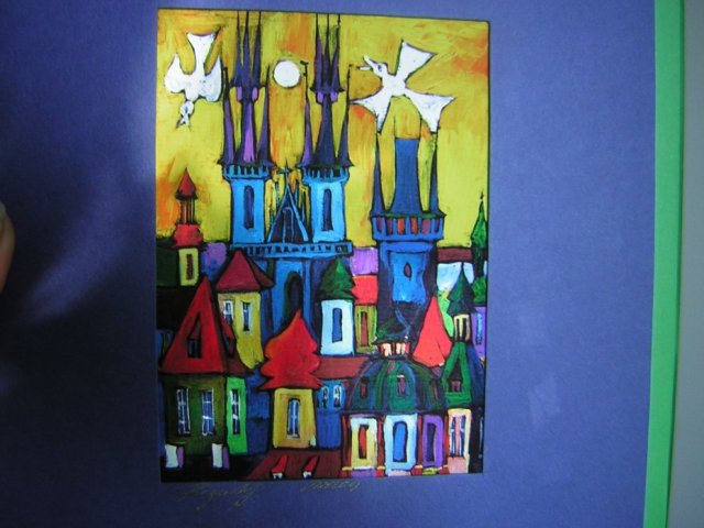 Bajkowy Oryginalny, ręcznie farbami wodnymi malowany obrazek. Oprawiony w czarną drewnianą ramkę / wykończenie satynowe/ i passpartou w kolorze chabrowo-niebieskim. Za szybką. Symboliczny w radosnych, żywych barwach, Podpis autora, którego niestety nie udało mi się odcyfrować.Ramka ma od tyłu łatwo wyjmowalną tekturkę ze stojakiem i haczykiem. Dodatkowo zamontowane dwa haczyki po bokach do zawieszenia na druciku, lub sznurku.