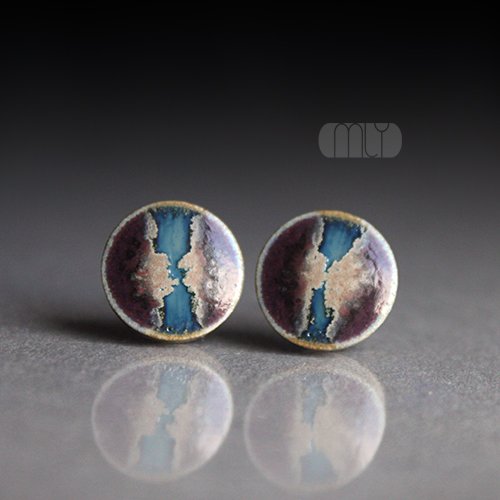Ceramiczne okrągłe kolczyki w formie sztyftów, ręcznie wykonane z delikatnej gliny kamionkowej, jednostronnie szkliwione mieszanką fioletowych i zielonych szkliw z efektem plamek i subtelnym połyskiem, na antyalergicznych sztyftach w kolorze srebrnym.Średnica ok. 11mm.. Polecam
