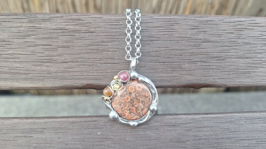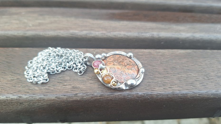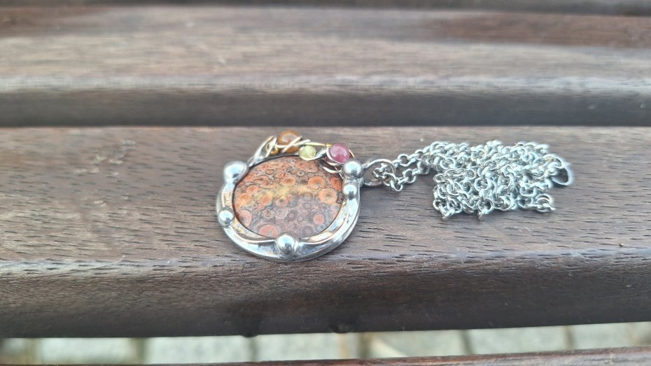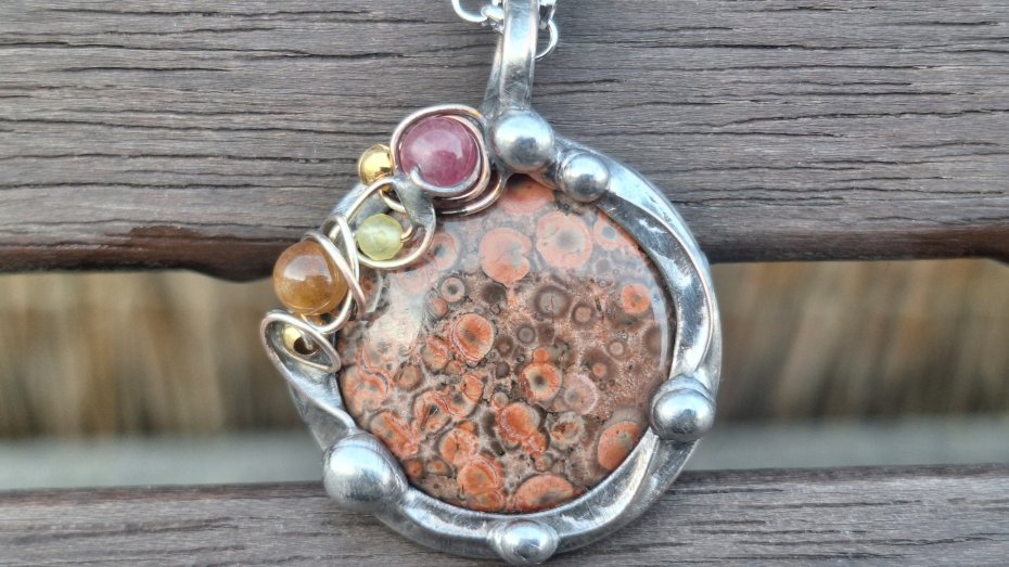 Wisiorek wykonany z miedzi, cyny, agatu, turmalinów i jaspisu. Wymiary ok. 2.7 na 2.7 cm. Zawieszony na łańcuszku o długości ok. 50 cm.