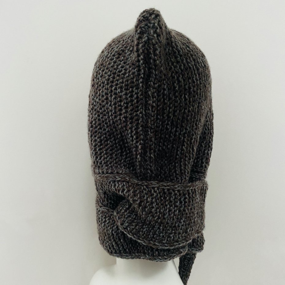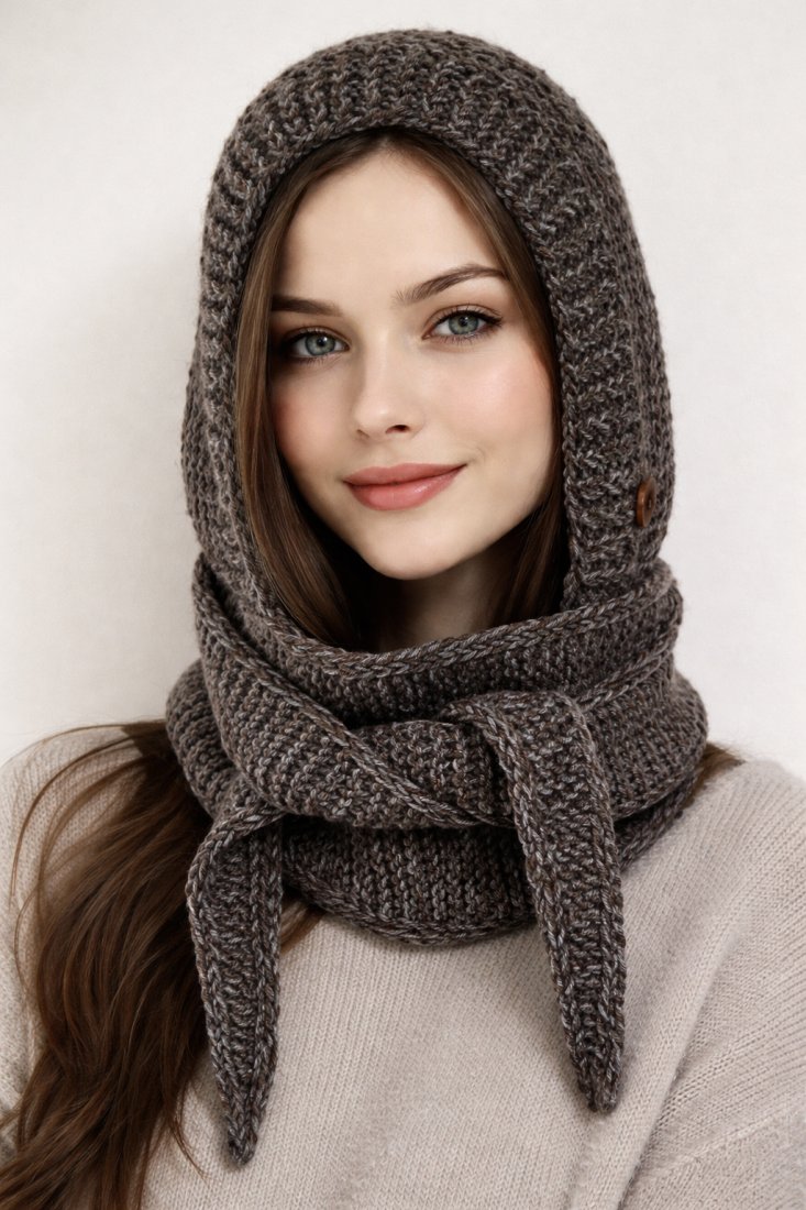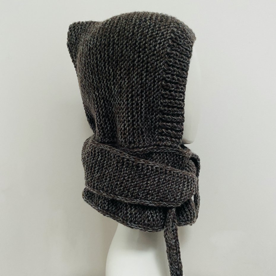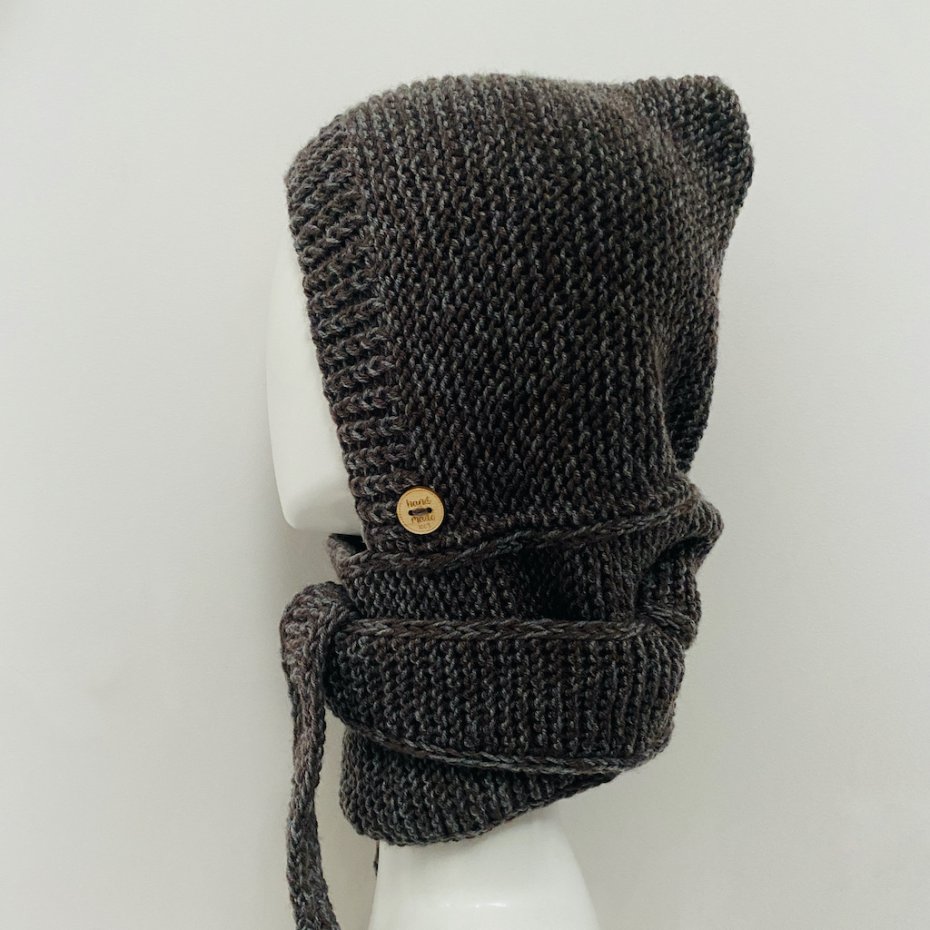 Kaptur wykonałam ręcznie na drutach z polskiej włóczki akrylowej, składającej się z dwóch nitek: pierwsza w kolorze ciemnego brązu, druga szarego. Delikatna struktura dzianiny dopasowuje się do kształtu głowy, zapewniając komfort noszenia bez uczucia ucisku.
