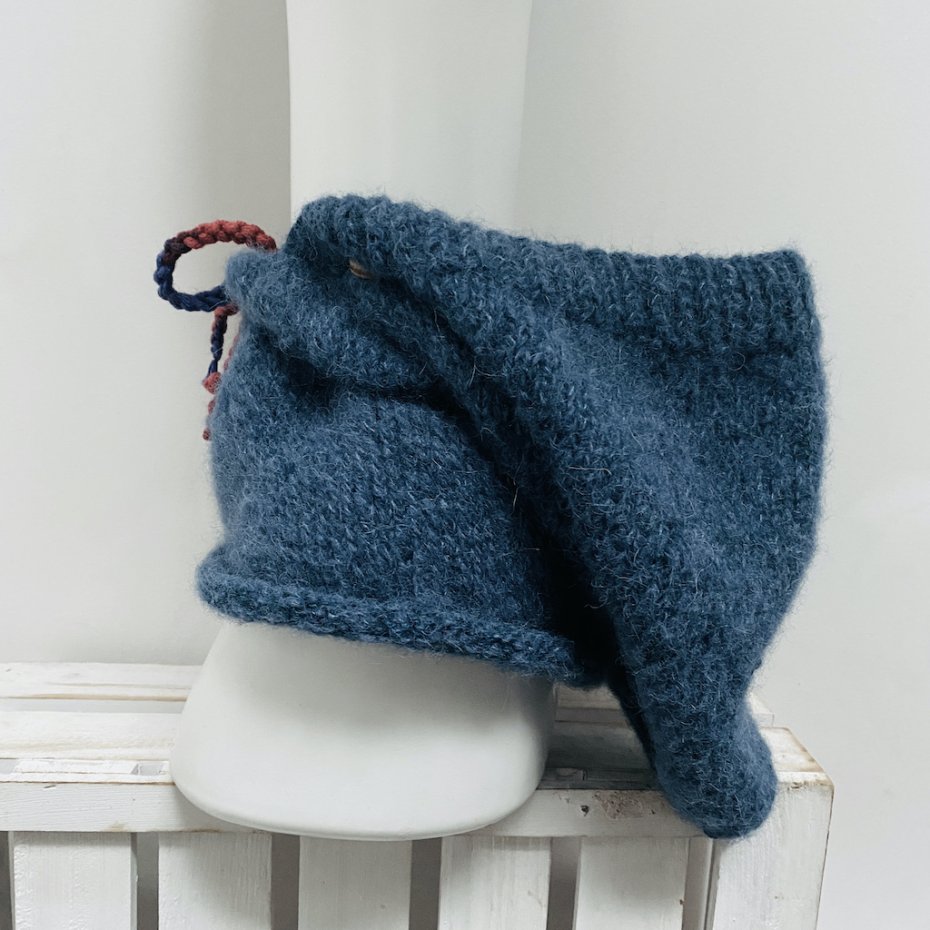 Kaptur z kominem i ściągaczem wykonałam ręcznie na drutach z miękkiej, ciepłej i przyjemnej w dotyku norweskiej włóczki, składającej się z dwóch nitek.