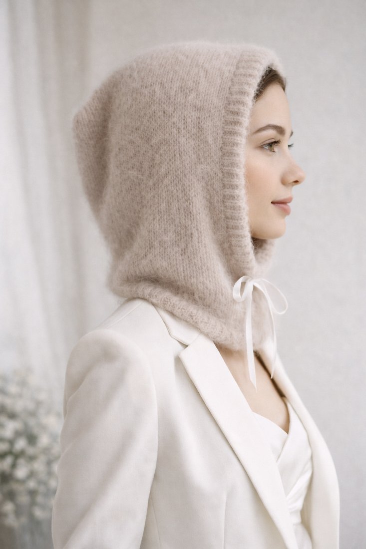 Atłasowa wstążka przy ściągaczu pozwala zawiązać kokardę pod szyją lub puścić ją swobodnie. Balaclava pięknie kadruje twarz, podkreśla spojrzenie i tworzy miękką ramę wokół dekoltu. Sprawdzi się podczas ceremonii w chłodniejszym sezonie, plenerowej sesji czy wieczornego przyjęcia.