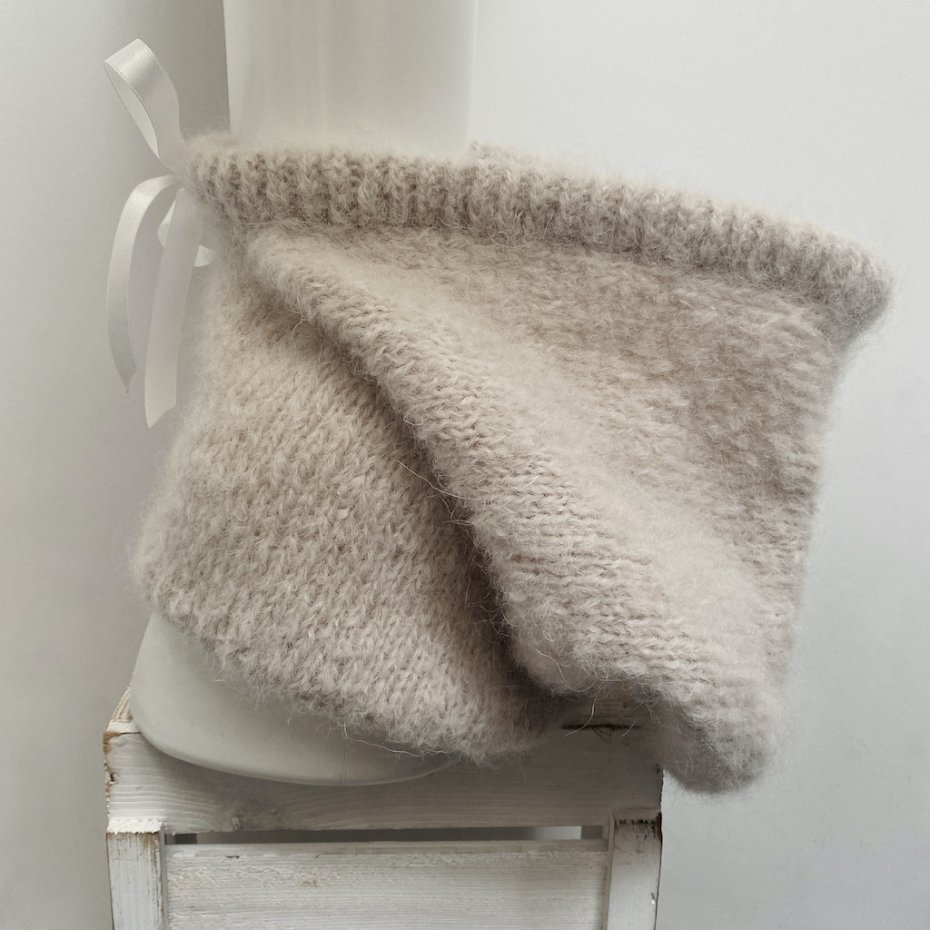 Ręcznie wykonana na drutach z wyjątkowo miękkiej mieszanki alpaki i merino, otula twarz delikatnym, puszystym splotem. Odcień marcepanu subtelnie współgra z bielą sukni, ecru garniturem czy minimalistyczną stylizacją ślubną, dodając całości nieoczywistego charakteru. To alternatywa dla welonu – bardziej intymna, współczesna, z nutą nonszalancji.