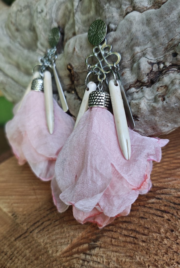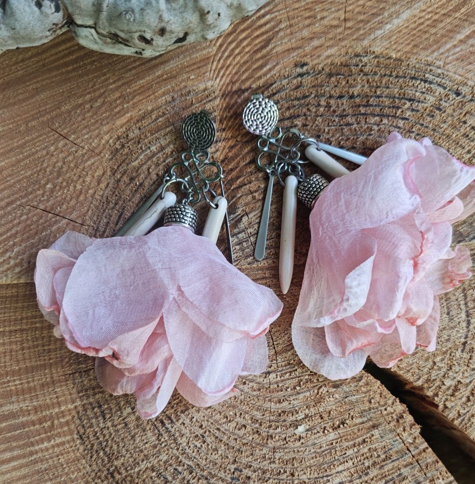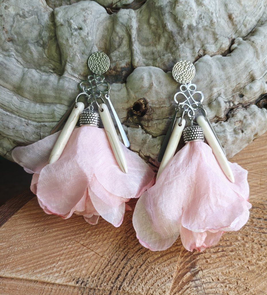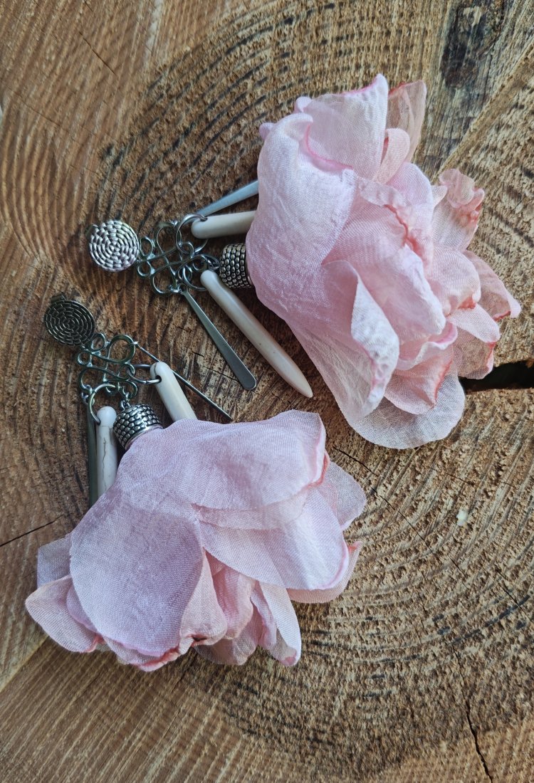 ,, balerina z howlitem,, to zwiewne kolczyki wykonane z tiulowego kwiatka w odcieniach różu, białego howlitu i metalowych elementów w kolorze srebrnym. Kolczyki zawieszone są na ozdobnych biglach typu sztyft wykonanych ze stali szlachetnej.
